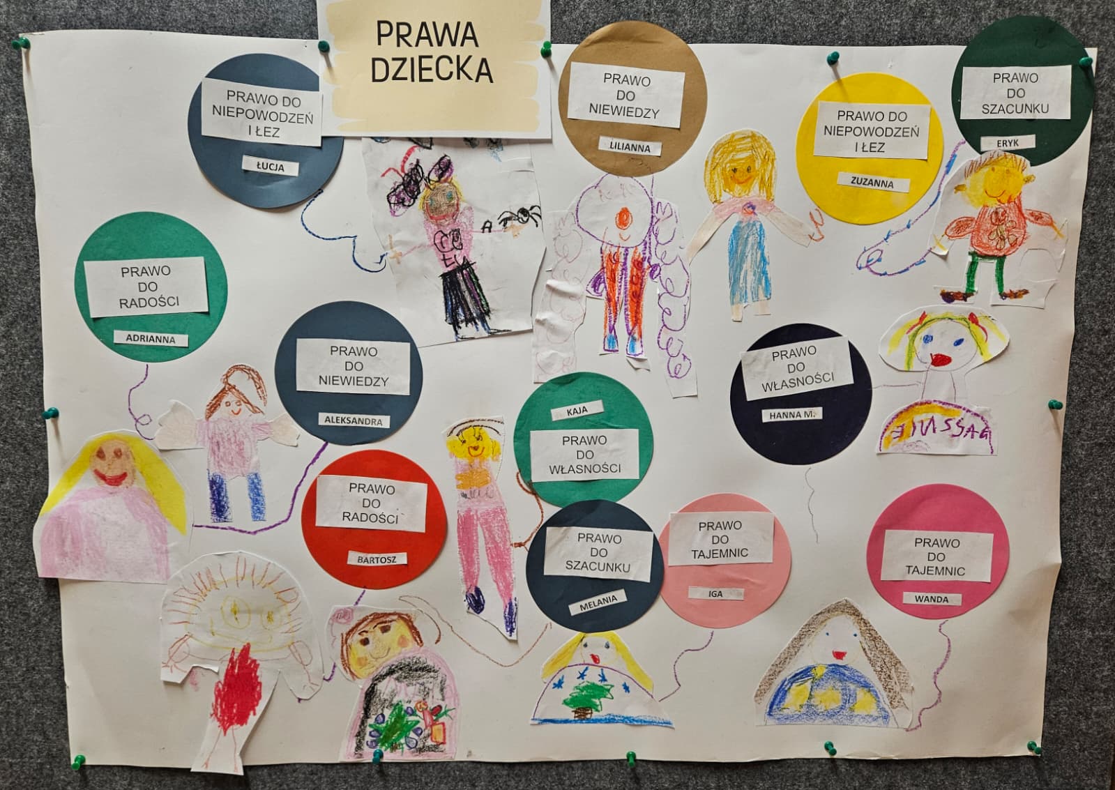 Zwieńczeniem zajęć było wykonanie wspólnego plakatu – wszystkie dzieci narysowały i umieściły swoją postać na dużym arkuszu papieru, a następnie z kół origami stworzyły kolorowe balony, na których znalazły się nazwy wybranych praw. Plakat został wyeksponowany na korytarzu przedszkolnym.